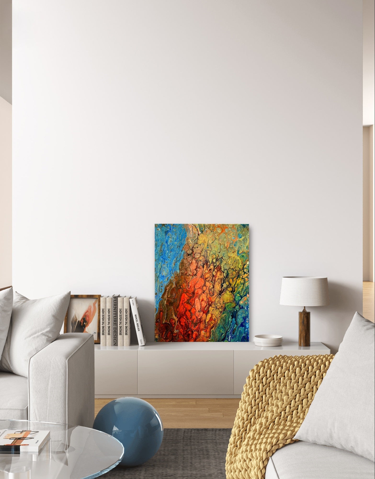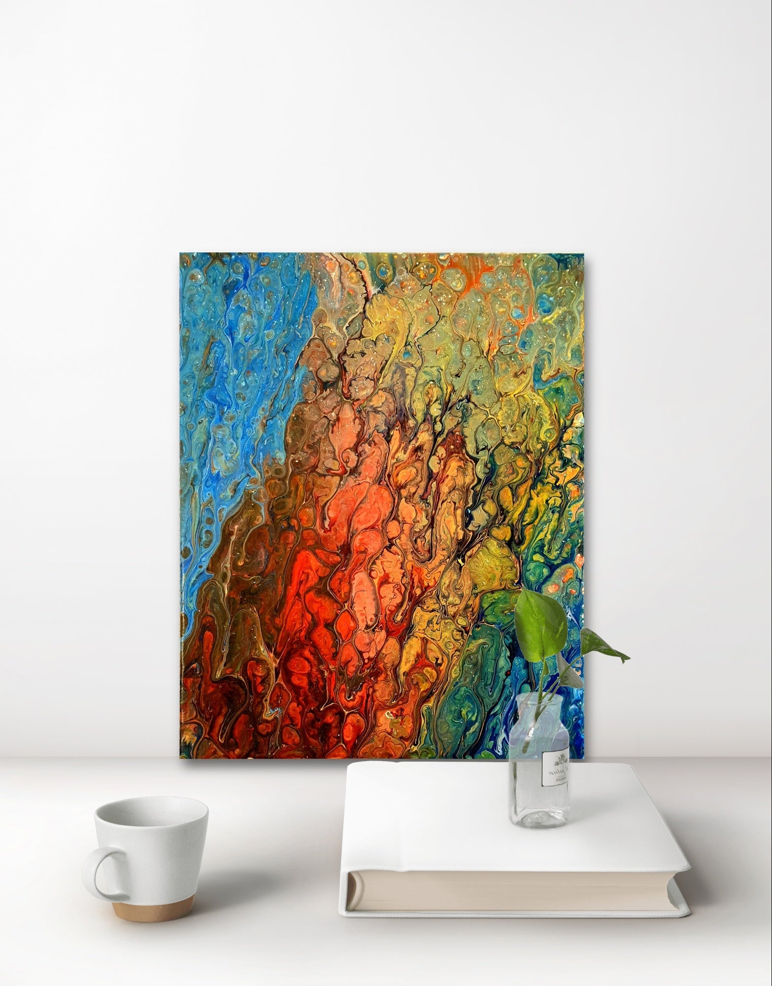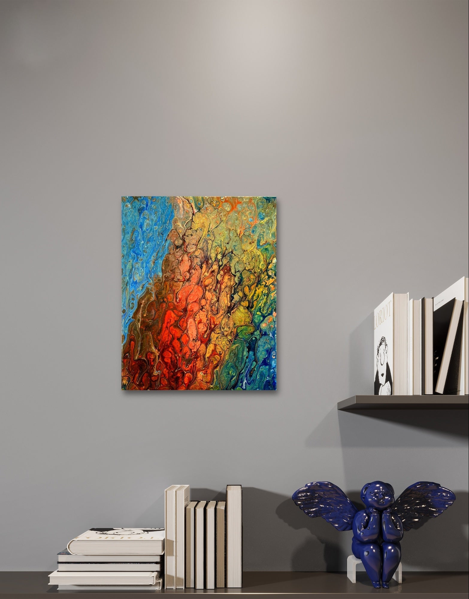 FLUID est une peinture acrylique sur toile réalisée avec la technique d'acrylic pouring et de création de cellules pour plus d'impact visuel.