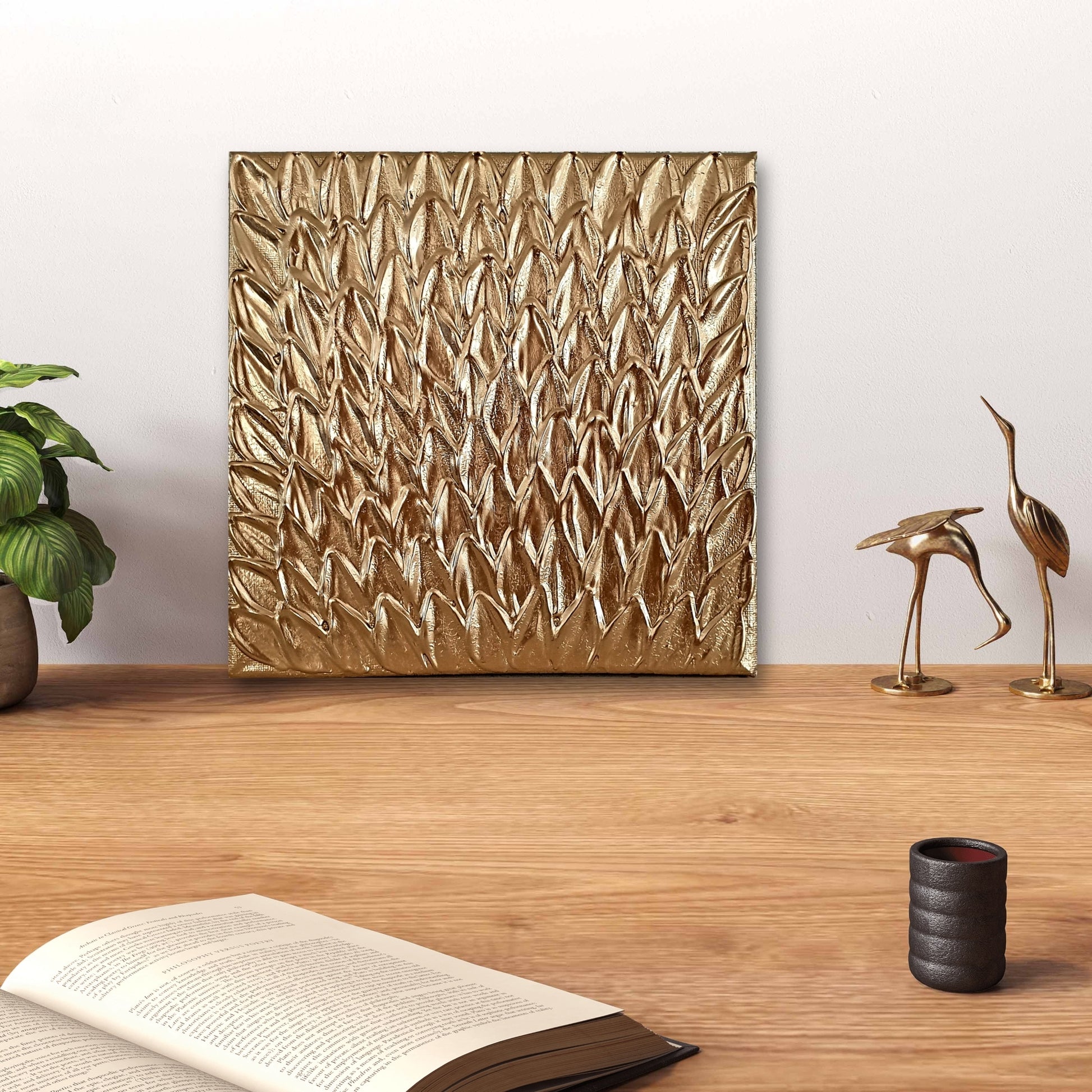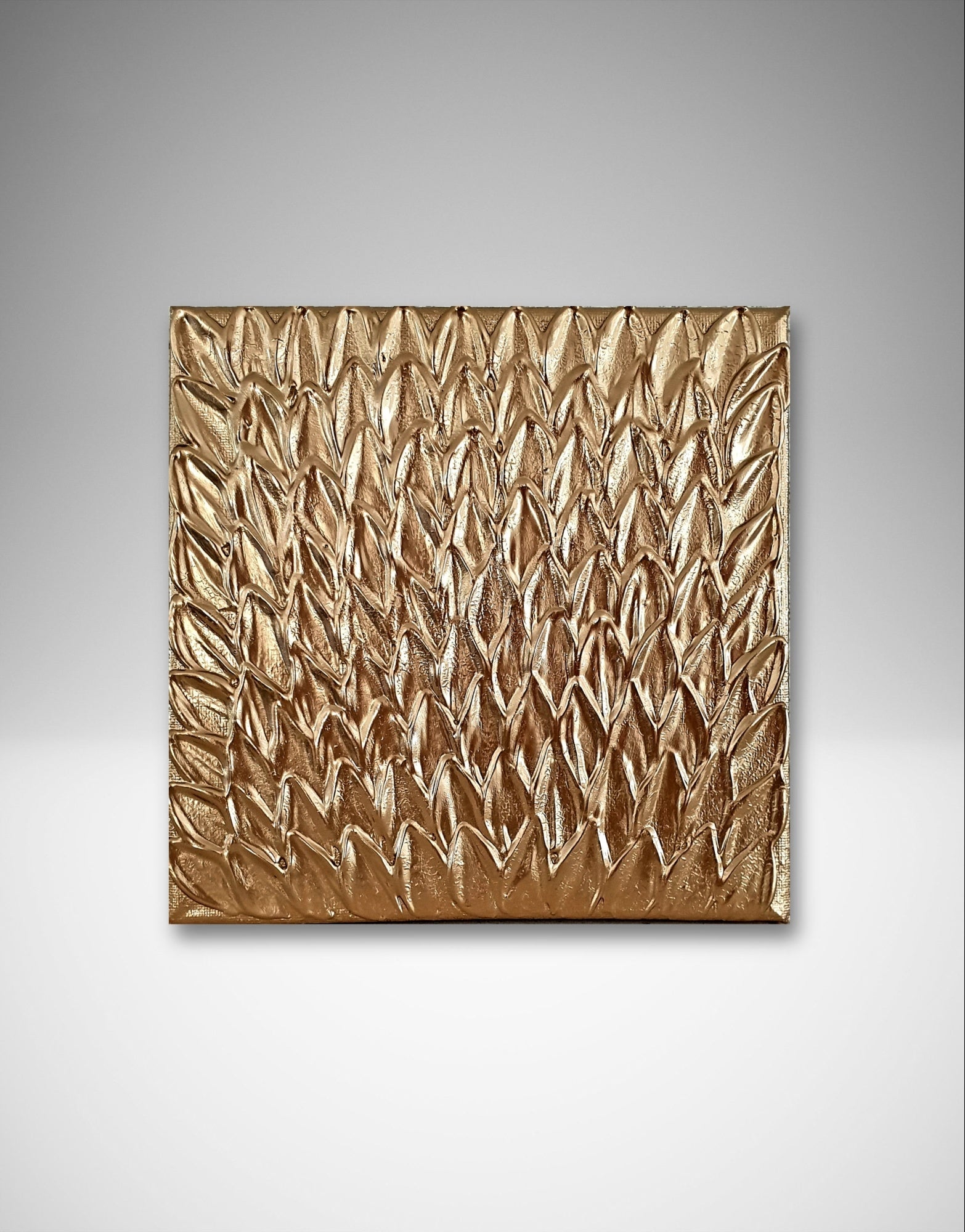 La "Golden Swan" est une peinture acrylique sur toile couleur or en relief, aux motifs en forme de plumes.