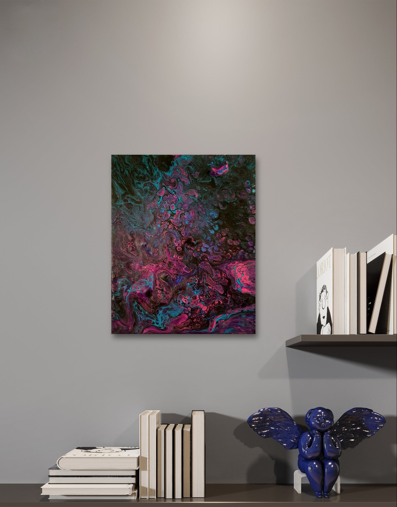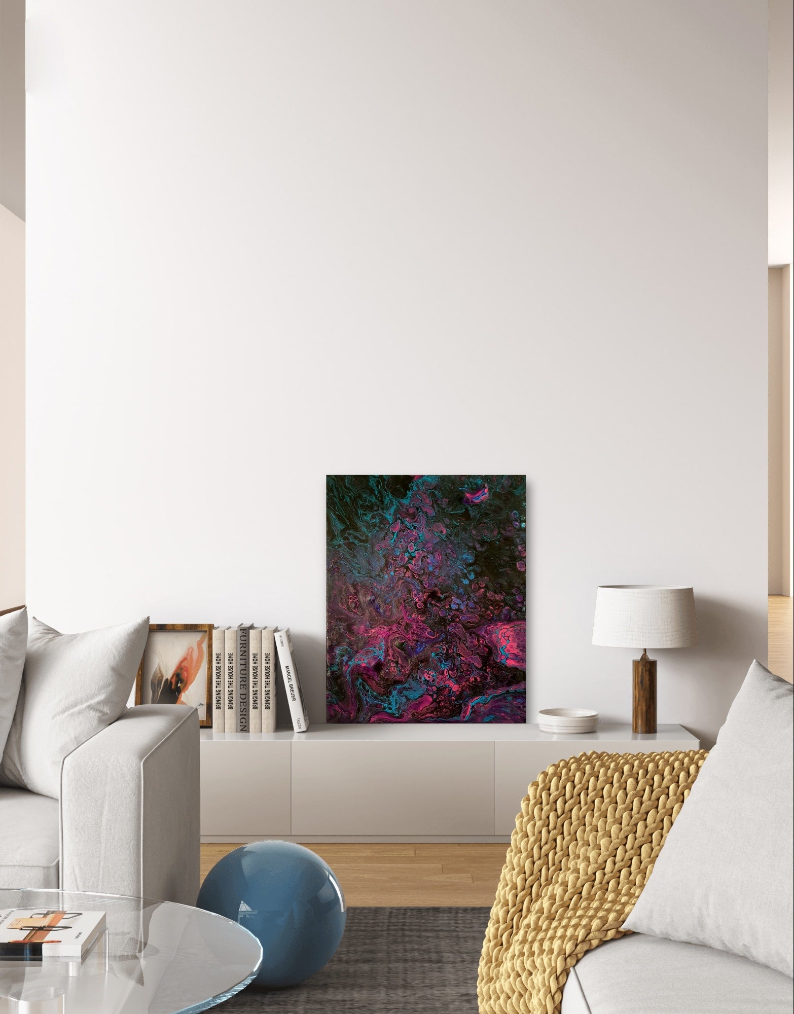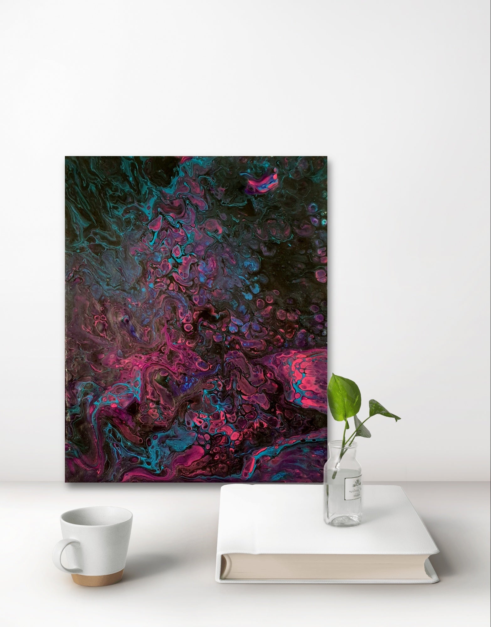 La toile PURPLE est une oeuvre réalisée avec la technique de l'acrylic pouring et de création de cellules.