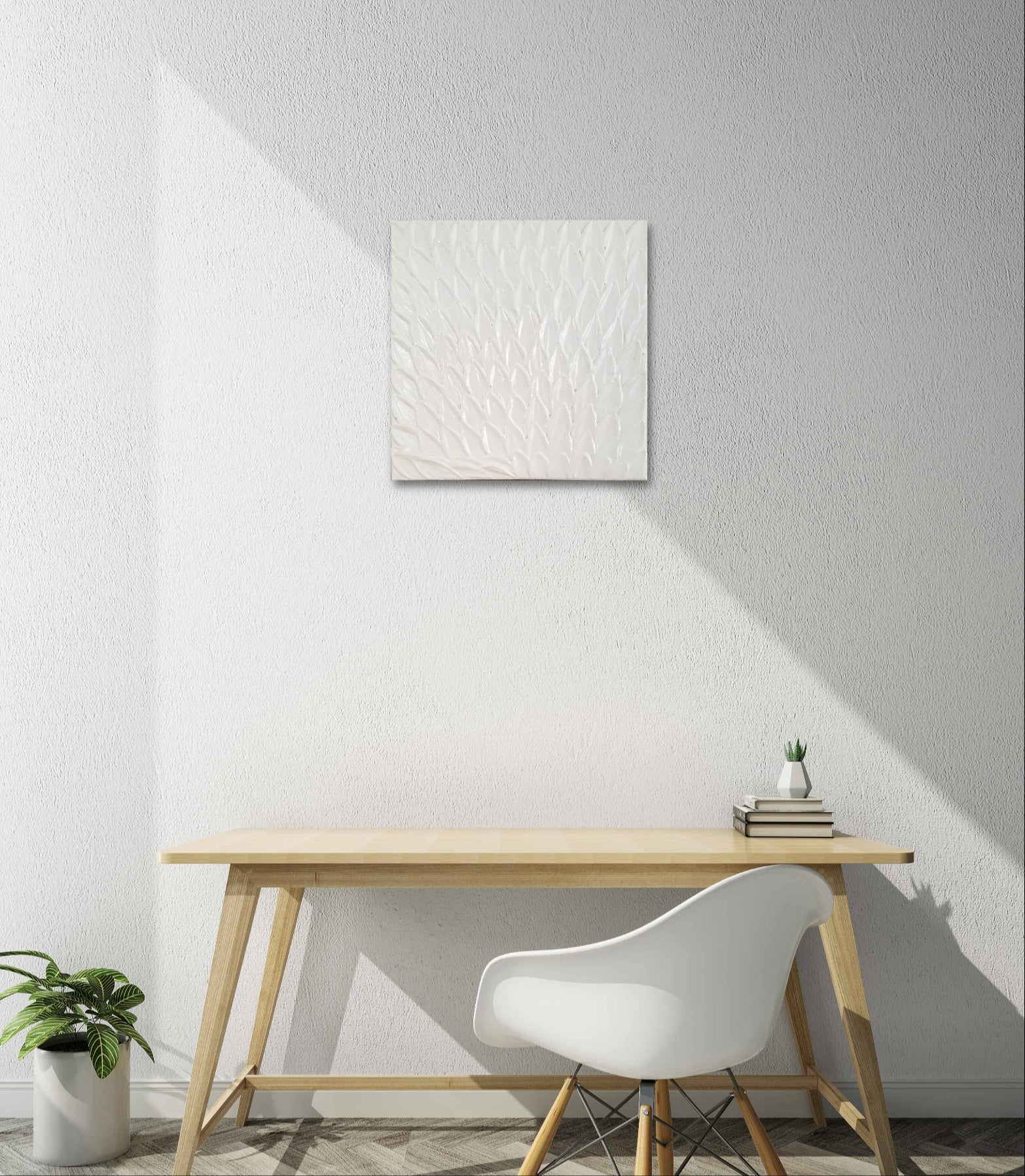 Le "Swan" est une toile en relief qui présente un motif de plume blanche en acrylique.